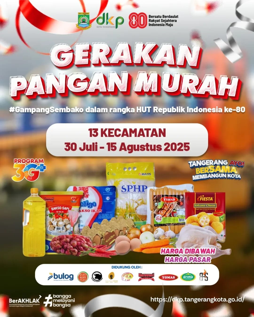 Gerakan Pangan Murah, yang mengusung tagar #GampangSembako, akan dilaksanakan serentak di 13 kecamatan di Kota Tangerang mulai 30 Juli hingga 15 Agustus 2025.