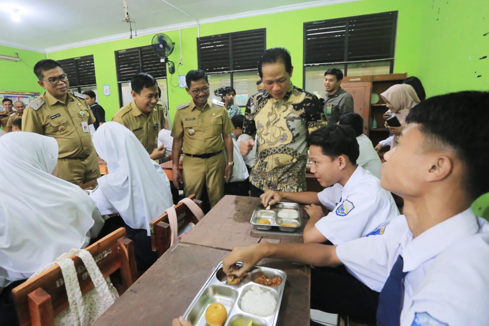 Selain urusan emisi dan industri, Menteri Hanif, juga meninjau pelaksanaan Program Makanan Bergizi Gratis (MBG) yang dijalankan di Kota Tangerang. Ia mengunjungi dapur penyedia MBG di SPPG Yayasan Nurul Kuncung Keroncong dan pelayanan langsung di SMPN 8 Kota Tangerang.